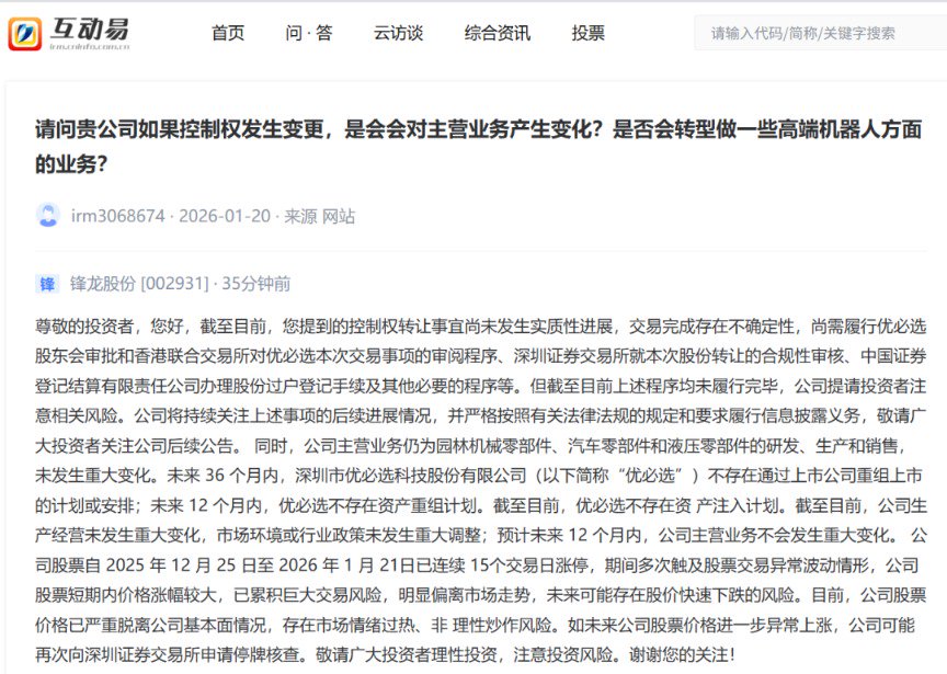当日,锋龙股份在互动易平台上回话投资者发问称,异日36个月内,澳门十大信誉网络赌城深圳市优必选科技股份有限公司不存在通过上市公司重组上市的商量或安排;异日12个月内,优必选不存在钞票重组商量。终局当今,优必选不存在钞票注入商量。