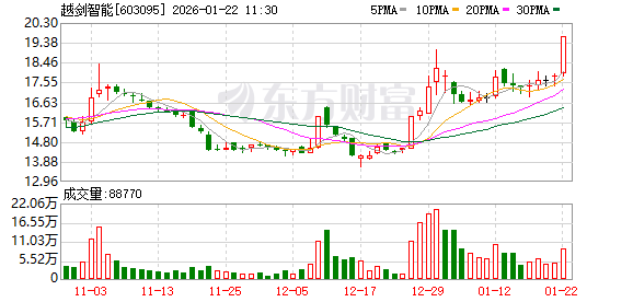 越剑智能股价创出历史新高,适度11:26,该股上升9.24%,股价报19.50元,成交量754.38万股,成交金额1.40亿元,换手率2.92%,该股最新A股总市值达50.36亿元,该股A股流畅市值50.36亿元。