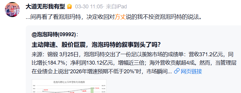 3月30日,段永平在雪球发帖称:“这两天花时代再看了看泡泡玛特,决定收回对住持(雪球首创东说念主、董事长方三文)说的我不投资泡泡玛特的说法”。