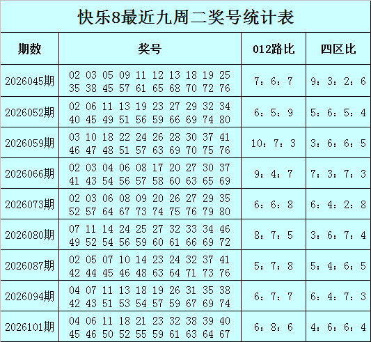 福彩清高8第2026101期(上周二)开奖总结:04 06 11 18 21 23 32 38 39 40 45 46 50 52 55 59 61 63 64 67,其中奖号四区比为4:6:6:4,012路比为6:8:6。
