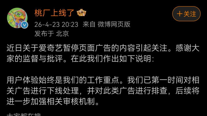 4月23日,爱奇艺官方发文恢复近期暂停页告白激发的争议。爱奇艺示意,用户体验恒久是责任重心,已第一技术对有关告白进行下线科罚,并对同类告白张开排查,后续将进一步加强审核机制。
