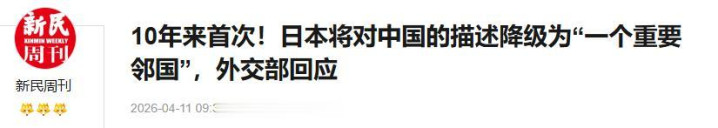 新民周刊2026-04-1110年来初次!日本将对中国的描画左迁为“一个重要邻国”,酬酢部恢复