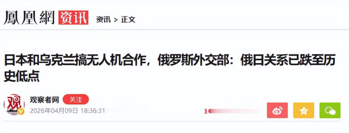不雅察者网2026年04月09日日本和乌克兰搞无东谈主机妥洽,俄罗斯酬酢部:俄日干系已跌至历史低点