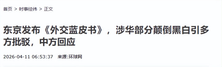 环球网2026-04-11东京发布《酬酢蓝皮书》,涉华部分倒置短长引多方筹商,中方恢复