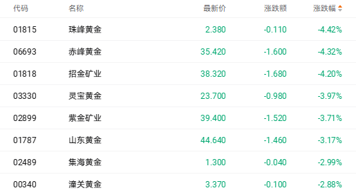 当天港股黄金股集体下挫。截止发稿,珠峰黄金(01815.HK)跌4.42%、赤峰黄金(06693.HK)跌4.32%、招金矿业(01818.HK)跌4.20%、灵宝黄金(03330.HK)跌3.97%。