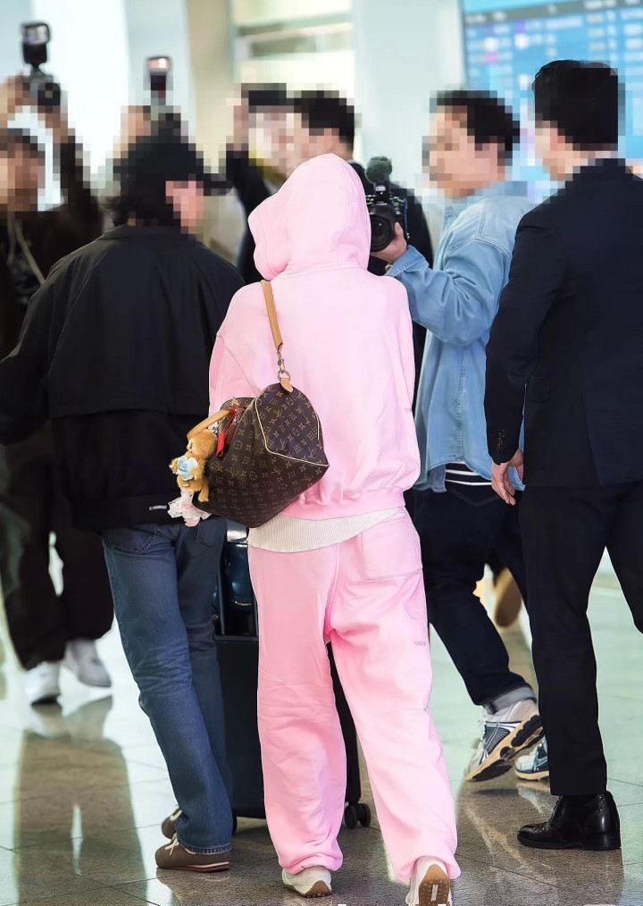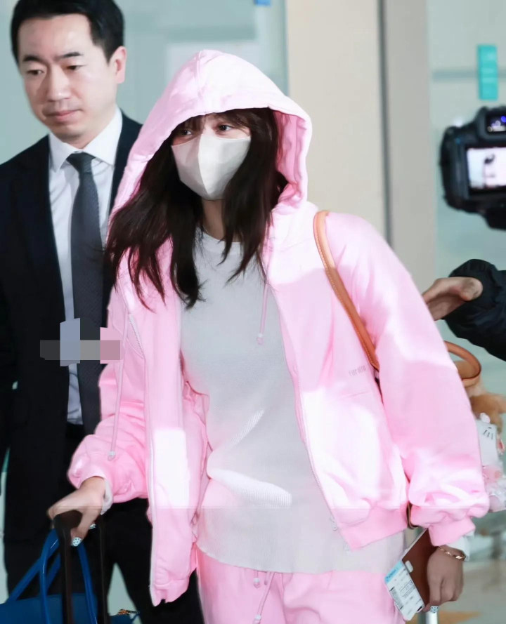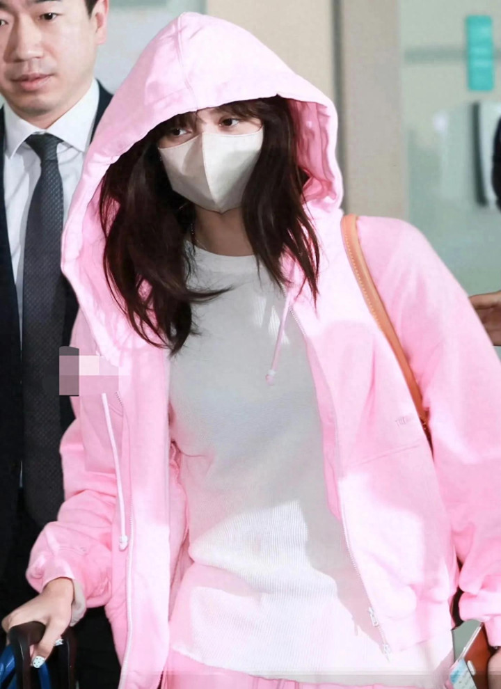 Lisa身穿粉色的通顺套装,内部搭配白色的上衣,她戴着卫衣的帽子,因为素颜外出,是以她戴了口罩,披垂着头发。