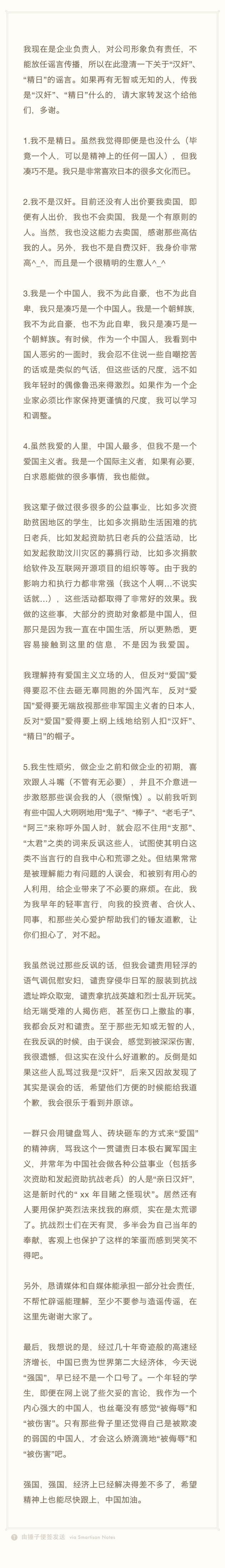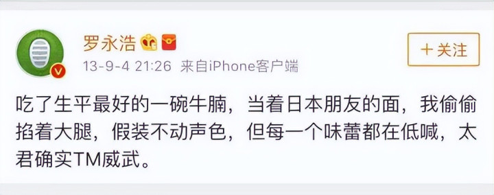 在这些言论里,罗永浩绝不诡秘对日本的真贵,屡次公设立表 “我爱日本” 之类的表述,在日本游玩时更是直言被当地的氛围深深纳降,甚而说出 “太君英武,我死也瞑目了” 这类特殊不当的话。