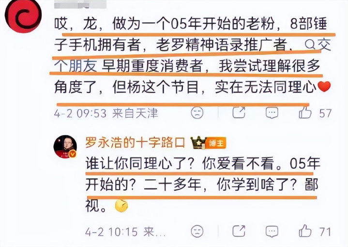 更有网友直言,本来以为罗永浩是真性情、敢语言,如今才发现,他的 “真性情” 不外是不分方位、不顾他东说念主感受的大肆宣泄,濒临善意齐能如斯强嘴硬牙,足以看出其待东说念主持事的立场。