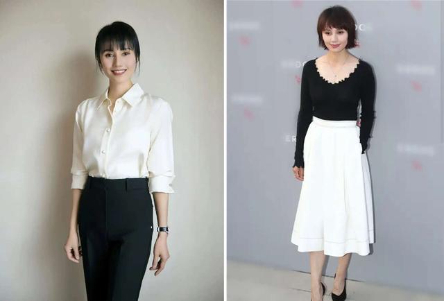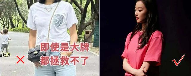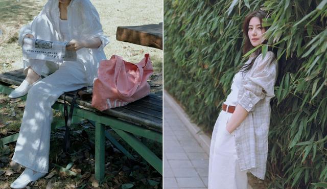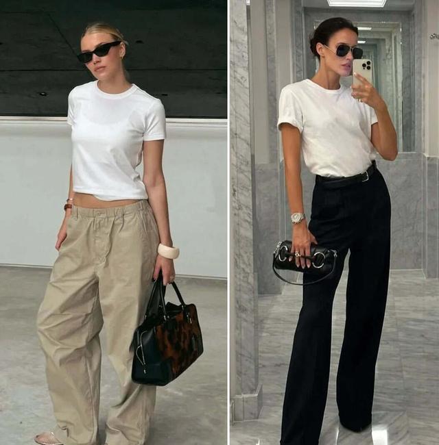 比如,一件白T,与卡其阔腿裤相搭,经典中又带有减龄;而与玄色西装裤相搭,干练中又表示出一股干净清流。
