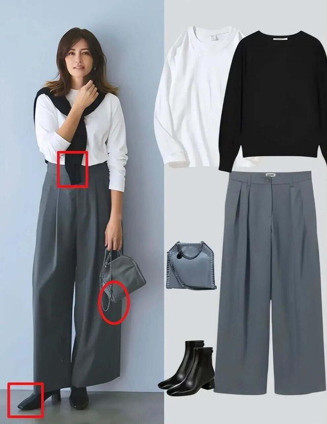 但为什么这位博主穿上却总让东谈主认为高档半分?原因就在于通盘这个词造型都汲取了“呼应”次第,比如,玄色披肩与玄色鞋子呼应,玄色挎包与灰色西装裤呼应,而上半身的白色则用来均衡黑、灰两种中性色。