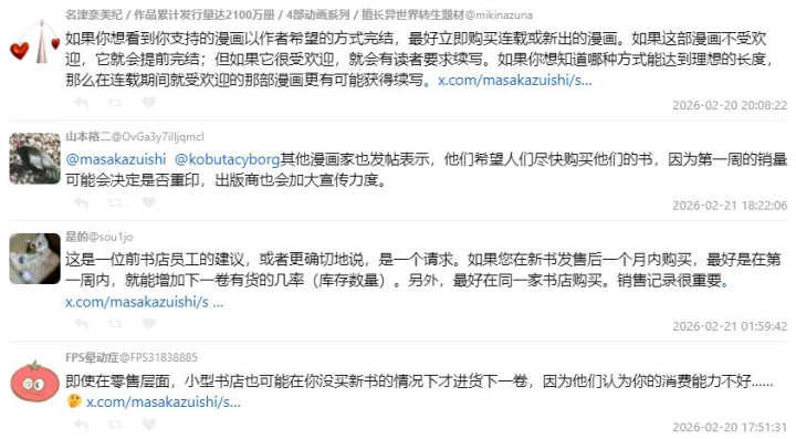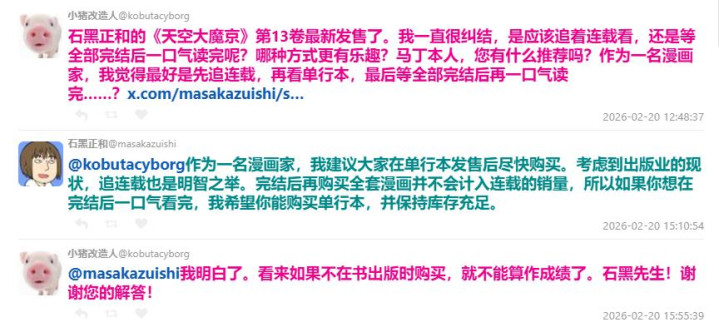 事情的启事,是一位日本网友在X上发问:漫画到底应该奈何扶植?是所有追连载、单行本一出就买,仍是等实现再一次性买皆?
